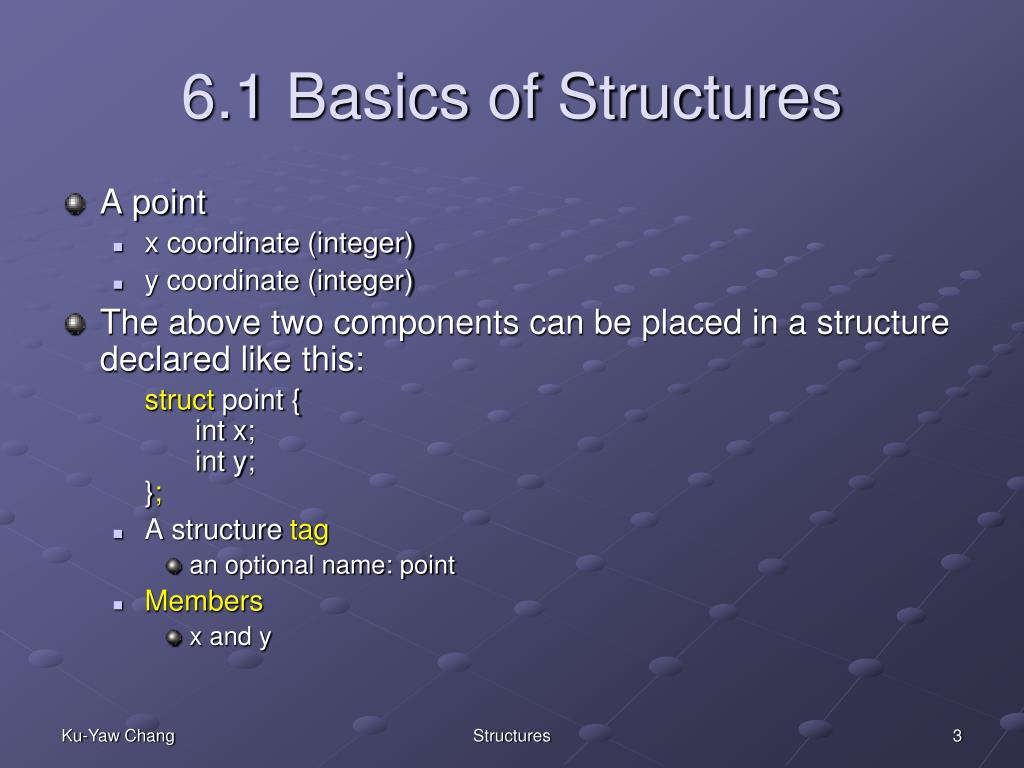 6.1 Basics of Structures • A point • x coordinate (integer) • y coordinate (integer) • The above two components can be placed in a structure declared like this: struct point { int x; int y;}; • A structure tag • an optional name: point • Members • x and y Structures