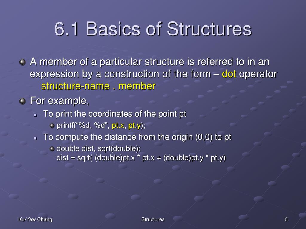 6.1 Basics of Structures • A member of a particular structure is referred to in an expression by a construction of the form – dot operatorstructure-name . member • For example, • To print the coordinates of the point pt • printf(“%d, %d”, pt.x, pt.y); • To compute the distance from the origin (0,0) to pt • double dist, sqrt(double);dist = sqrt( (double)pt.x * pt.x + (double)pt.y * pt.y) Structures
