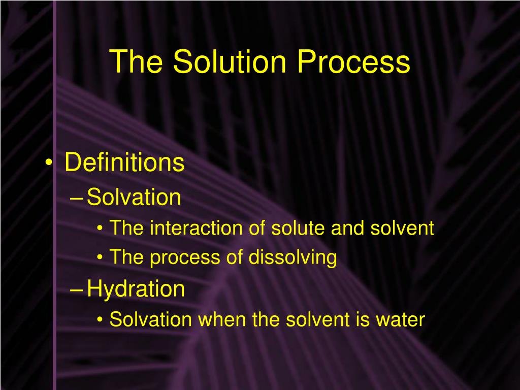 The Solution Process • Definitions • Solvation • The interaction of solute and solvent • The process of dissolving • Hydration • Solvation when the solvent is water