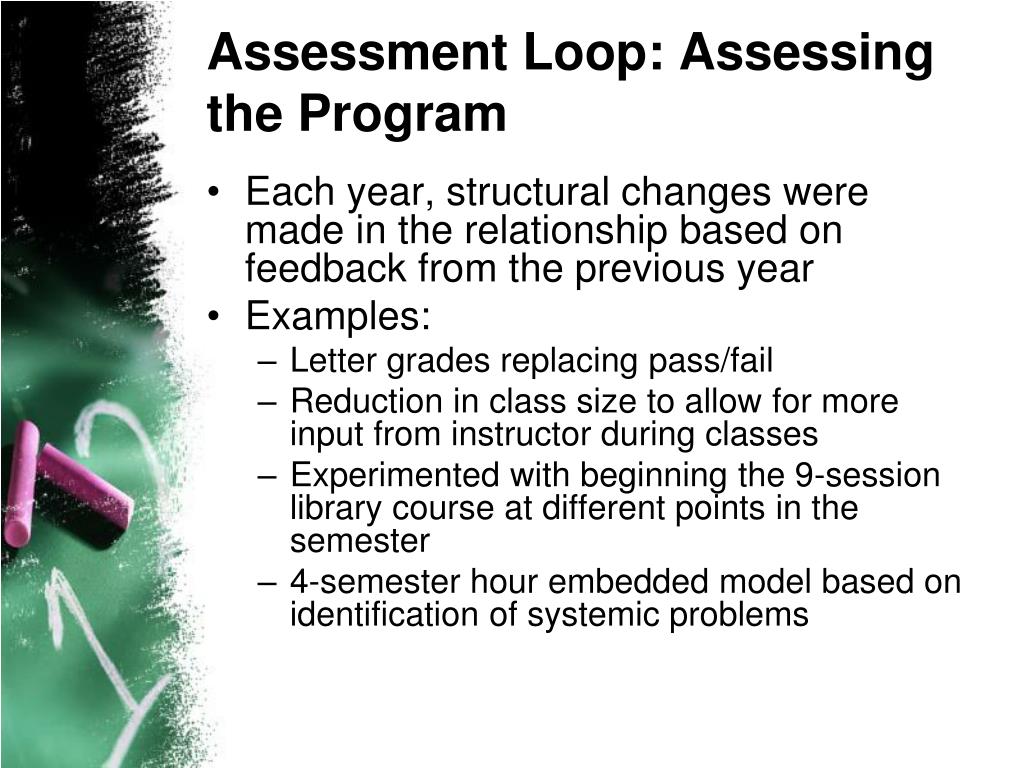 Assessment Loop: Assessing the Program • Each year, structural changes were made in the relationship based on feedback from the previous year • Examples: • Letter grades replacing pass/fail • Reduction in class size to allow for more input from instructor during classes • Experimented with beginning the 9-session library course at different points in the semester • 4-semester hour embedded model based on identification of systemic problems