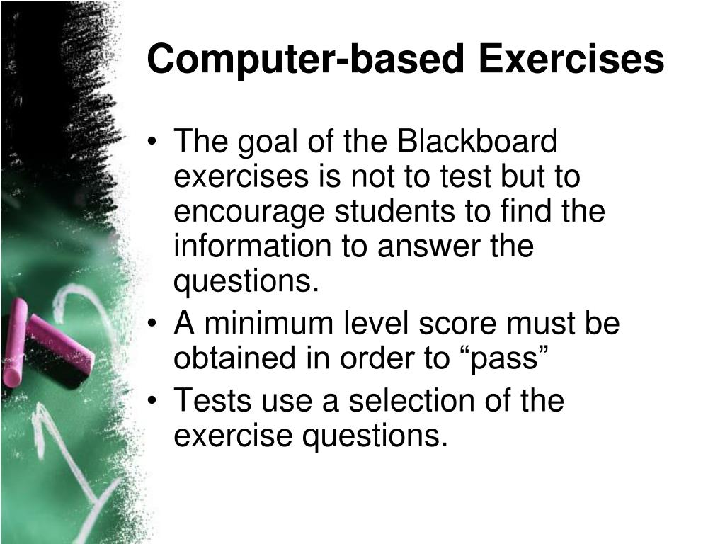 Computer-based Exercises The goal of the Blackboard exercises is not to test but to encourage students to find the information to answer the questions. A minimum level score must be obtained in order to “pass” Tests use a selection of the exercise questions.