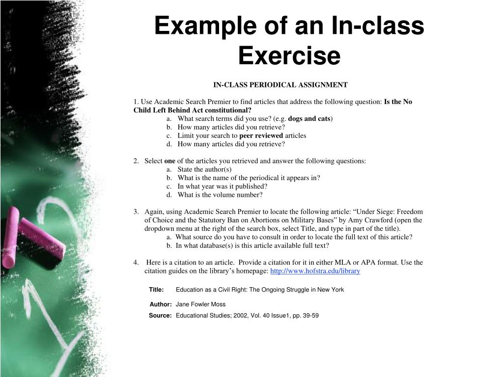 Learning communities first initiated in late 1990s Began as 6 clusters: 3-4 thematically-related courses Standalone seminars introduced in 2003 42 seminars and 20 clusters projected for fall 2008 2001: Library offered 2 sections of Library 001, a 1-credit standalone course Aimed at—but not restricted to—1st & 2nd year students Pass/fail grading 2002: expanded to 4 sections Background at HofstraFirst Year Programs (FYP) Library 001