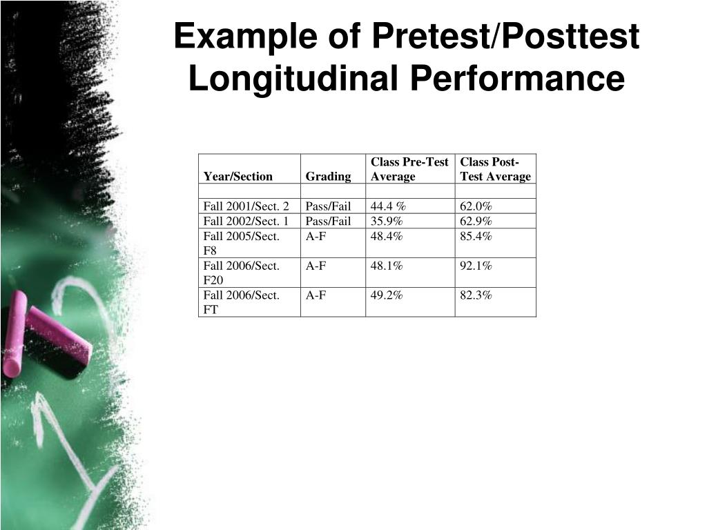 Assessment of Individual Classes Pretest/Posttests Interactive exercises using Blackboard Other in-class exercises Direct assessments: research assignments Course & Teacher Ratings
