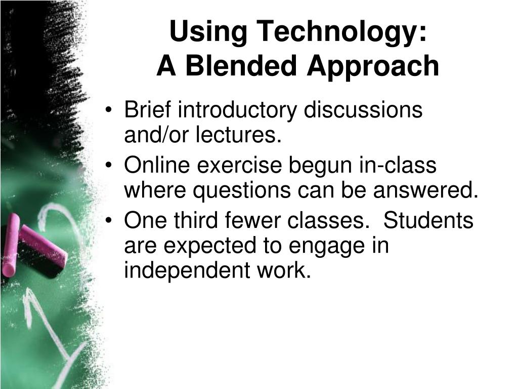 Using Technology:A Blended Approach Brief introductory discussions and/or lectures. Online exercise begun in-class where questions can be answered. One third fewer classes. Students are expected to engage in independent work.