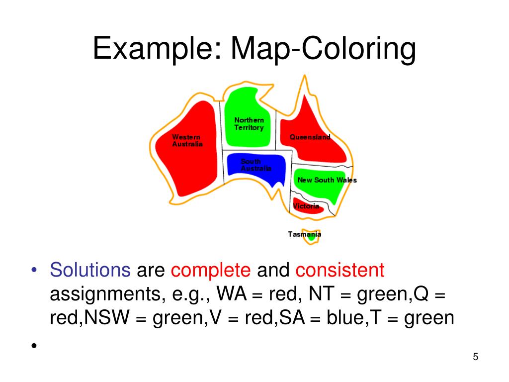 Example: Map-Coloring • Solutions are complete and consistent assignments, e.g., WA = red, NT = green,Q = red,NSW = green,V = red,SA = blue,T = green