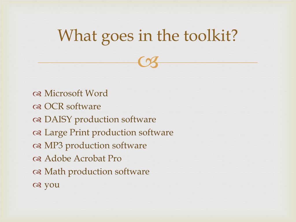 What goes in the toolkit? • Microsoft Word • OCR software • DAISY production software • Large Print production software • MP3 production software • Adobe Acrobat Pro • Math production software • you