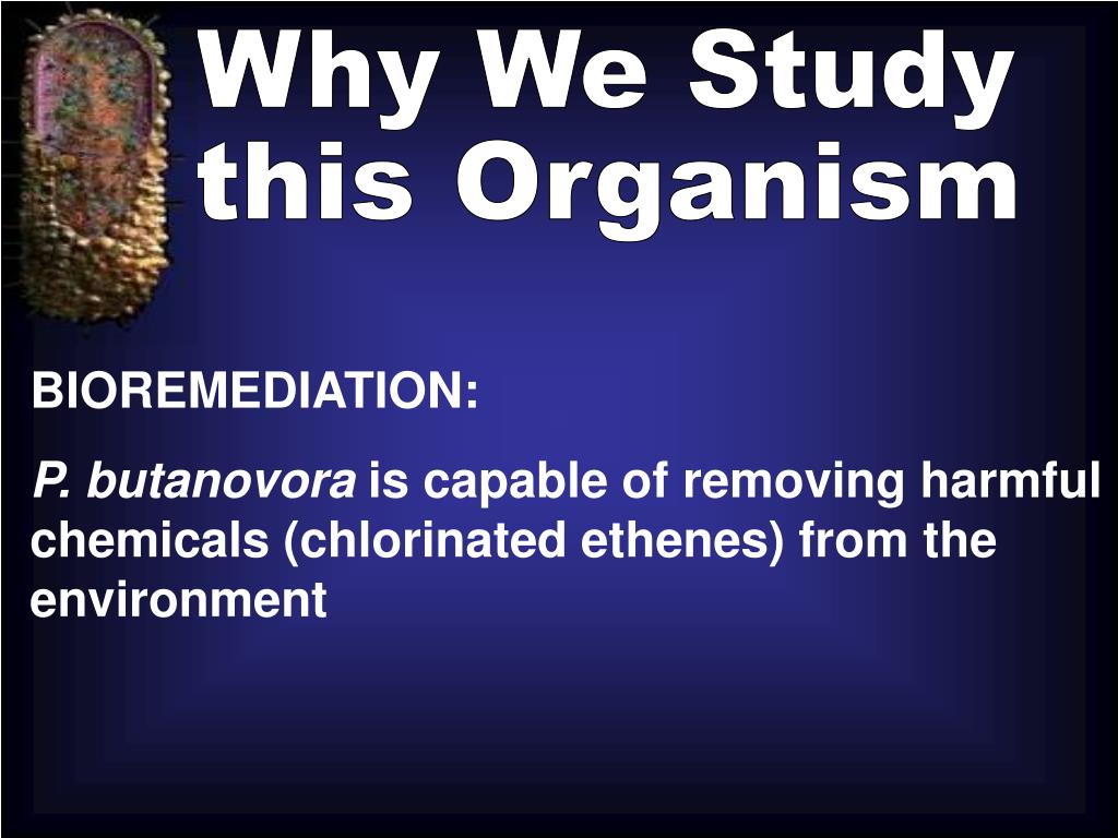 Why We Study this Organism BIOREMEDIATION: P. butanovora is capable of removing harmful chemicals (chlorinated ethenes) from the environment