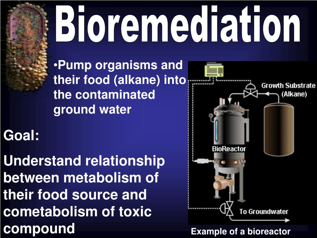 Bioremediation • Pump organisms and their food (alkane) into the contaminated ground water Goal: Understand relationship between metabolism of their food source and cometabolism of toxic compound Example of a bioreactor