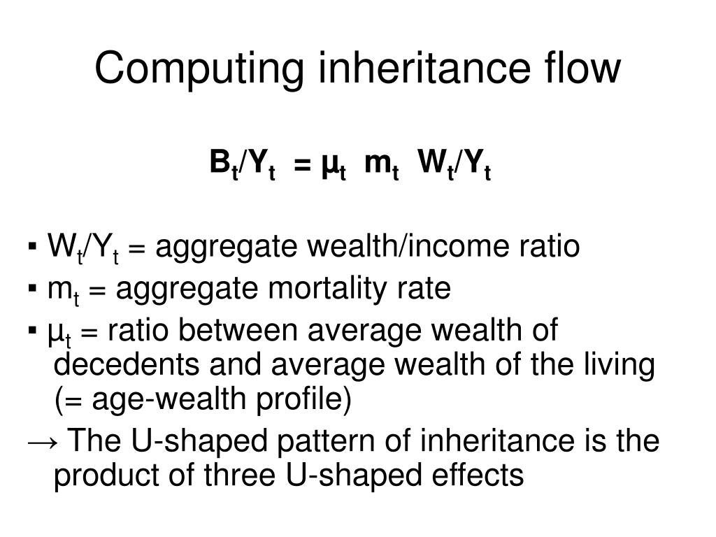 Computing inheritance flow Bt/Yt = µt mt Wt/Yt ▪ Wt/Yt = aggregate wealth/income ratio ▪ mt = aggregate mortality rate ▪ µt = ratio between average wealth of decedents and average wealth of the living (= age-wealth profile) → The U-shaped pattern of inheritance is the product of three U-shaped effects