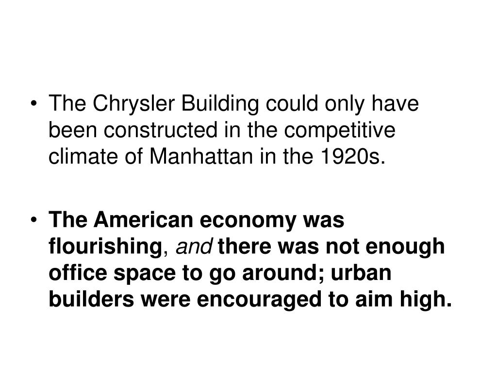 The Chrysler Building could only have been constructed in the competitive climate of Manhattan in the 1920s. • The American economy was flourishing, andthere was not enough office space to go around; urban builders were encouraged to aim high.
