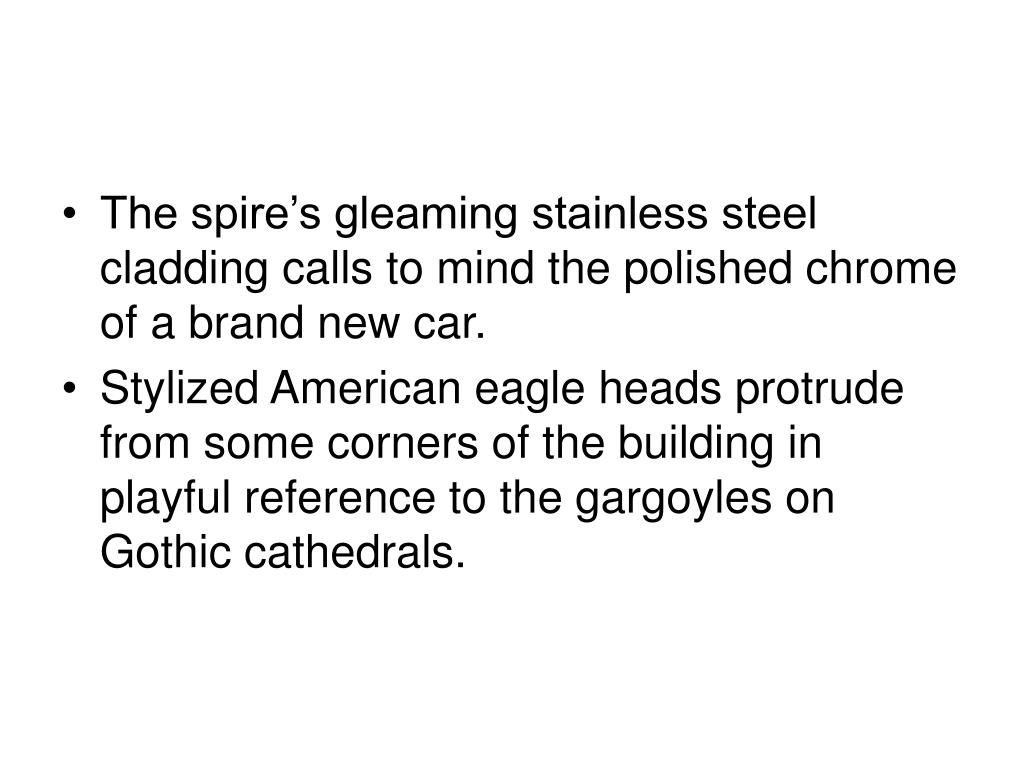 The spire’s gleaming stainless steel cladding calls to mind the polished chrome of a brand new car. • Stylized American eagle heads protrude from some corners of the building in playful reference to the gargoyles on Gothic cathedrals.