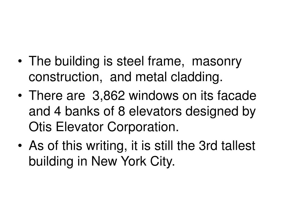 The building is steel frame, masonry construction, and metal cladding. • There are 3,862 windows on its facade and 4 banks of 8 elevators designed by Otis Elevator Corporation. • As of this writing, it is still the 3rd tallest building in New York City.
