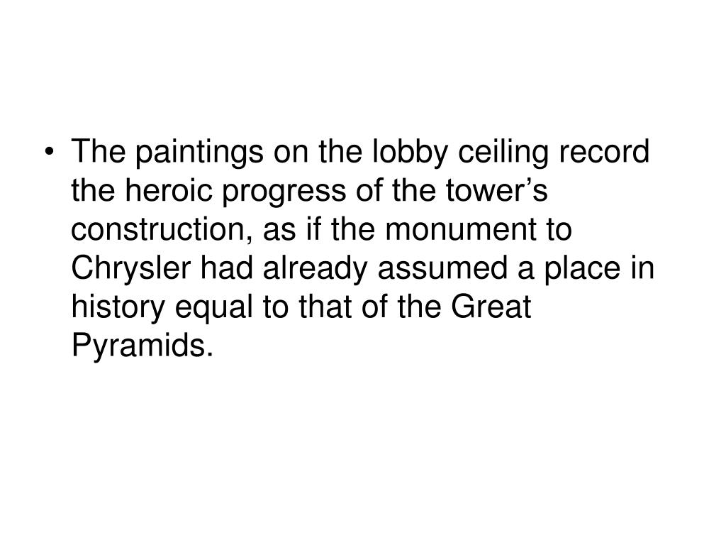 The paintings on the lobby ceiling record the heroic progress of the tower’s construction, as if the monument to Chrysler had already assumed a place in history equal to that of the Great Pyramids.