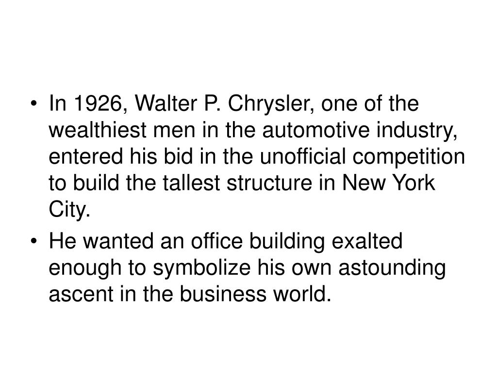 In 1926, Walter P. Chrysler, one of the wealthiest men in the automotive industry, entered his bid in the unofficial competition to build the tallest structure in New York City. • He wanted an office building exalted enough to symbolize his own astounding ascent in the business world.