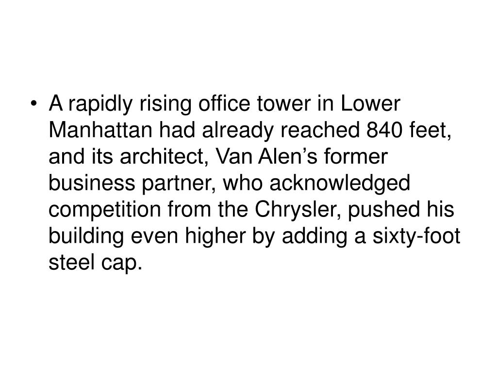 A rapidly rising office tower in Lower Manhattan had already reached 840 feet, and its architect, Van Alen’s former business partner, who acknowledged competition from the Chrysler, pushed his building even higher by adding a sixty-foot steel cap.