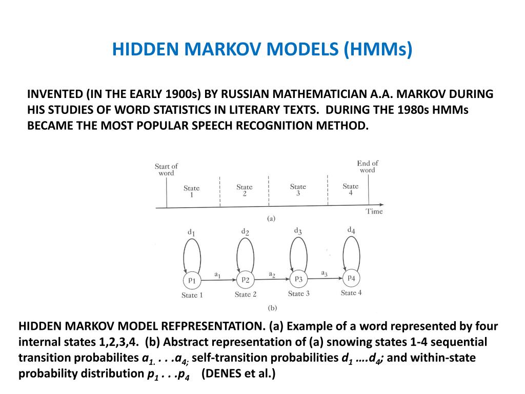 HIDDEN MARKOV MODELS (HMMs) INVENTED (IN THE EARLY 1900s) BY RUSSIAN MATHEMATICIAN A.A. MARKOV DURING HIS STUDIES OF WORD STATISTICS IN LITERARY TEXTS. DURING THE 1980s HMMs BECAME THE MOST POPULAR SPEECH RECOGNITION METHOD. HIDDEN MARKOV MODEL REFPRESENTATION. (a) Example of a word represented by four internal states 1,2,3,4. (b) Abstract representation of (a) snowing states 1-4 sequential transition probabilites a1. . . .a4;self-transition probabilities d1 ….d4; and within-state probability distribution p1 . . .p4 (DENES et al.)