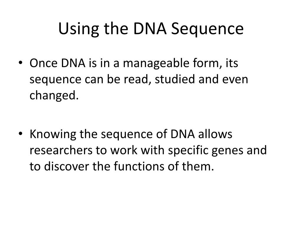 Using the DNA Sequence • Once DNA is in a manageable form, its sequence can be read, studied and even changed. • Knowing the sequence of DNA allows researchers to work with specific genes and to discover the functions of them.