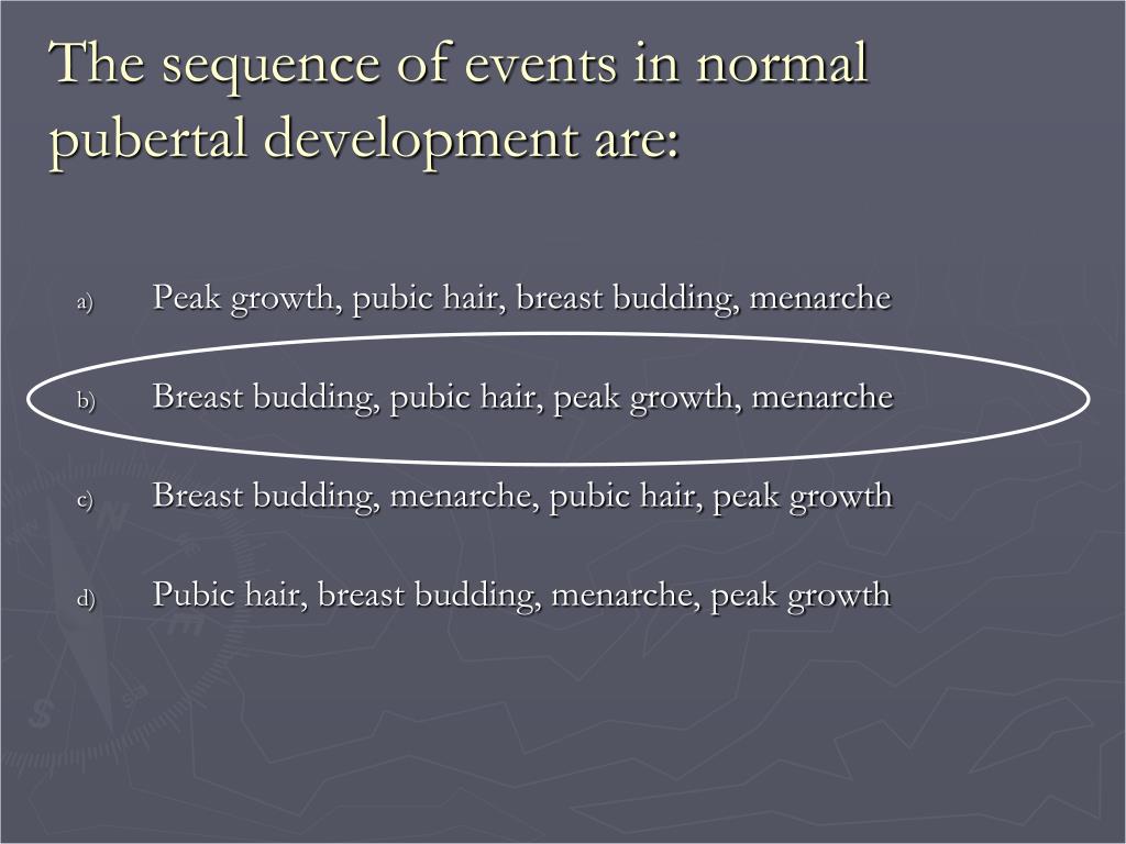 The sequence of events in normal pubertal development are: • Peak growth, pubic hair, breast budding, menarche • Breast budding, pubic hair, peak growth, menarche • Breast budding, menarche, pubic hair, peak growth • Pubic hair, breast budding, menarche, peak growth
