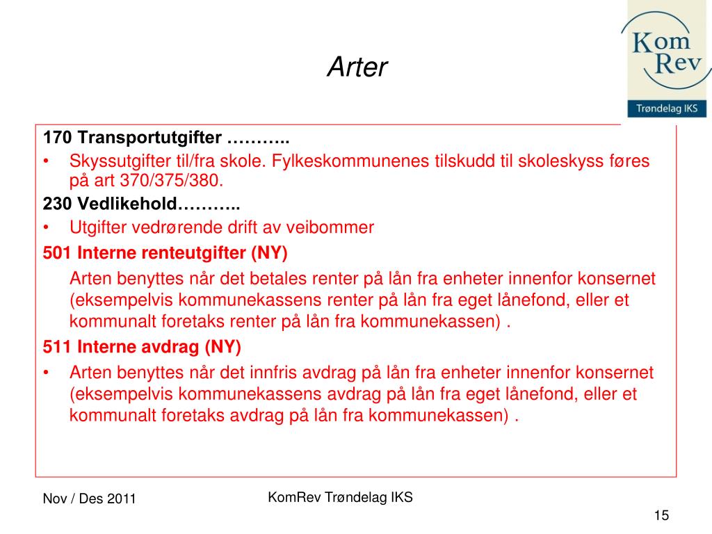 Arter 170 Transportutgifter ……….. • Skyssutgifter til/fra skole. Fylkeskommunenes tilskudd til skoleskyss føres på art 370/375/380. 230 Vedlikehold……….. • Utgifter vedrørende drift av veibommer 501 Interne renteutgifter (NY) Arten benyttes når det betales renter på lån fra enheter innenfor konsernet (eksempelvis kommunekassens renter på lån fra eget lånefond, eller et kommunalt foretaks renter på lån fra kommunekassen) . 511 Interne avdrag (NY) • Arten benyttes når det innfris avdrag på lån fra enheter innenfor konsernet (eksempelvis kommunekassens avdrag på lån fra eget lånefond, eller et kommunalt foretaks avdrag på lån fra kommunekassen) .