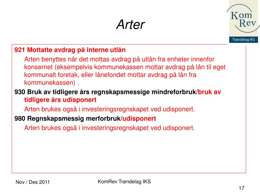 Arter 921 Mottatte avdrag på interne utlån Arten benyttes når det mottas avdrag på utlån fra enheter innenfor konsernet (eksempelvis kommunekassen mottar avdrag på lån til eget kommunalt foretak, eller lånefondet mottar avdrag på lån fra kommunekassen) . 930 Bruk av tidligere års regnskapsmessige mindreforbruk/bruk av tidligere års udisponert Arten brukes også i investeringsregnskapet ved udisponert. 980 Regnskapsmessig merforbruk/udisponert Arten brukes også i investeringsregnskapet ved udisponert.