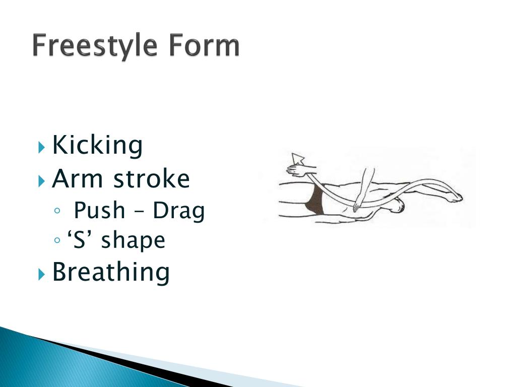 Freestyle Form • Kicking • Arm stroke • Push – Drag • ‘S’ shape • Breathing