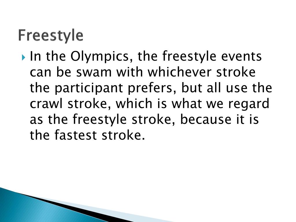 Freestyle • In the Olympics, the freestyle events can be swam with whichever stroke the participant prefers, but all use the crawl stroke, which is what we regard as the freestyle stroke, because it is the fastest stroke.