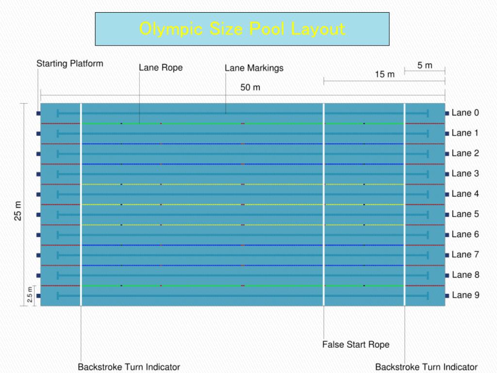 Facts • Olympic size pool is 50m • 100 meters (328.1ft) = 2 laps in an Olympic size pool or 4 in a regular size pool • Lap - from one side to the other.
