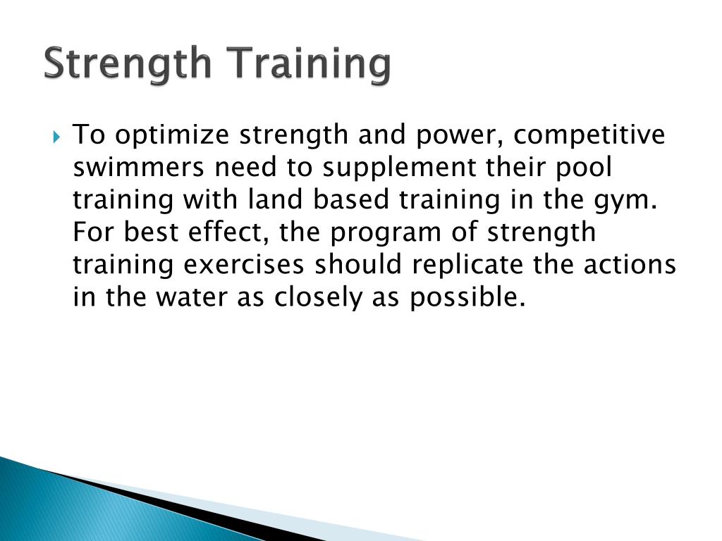 Strength Training • To optimize strength and power, competitive swimmers need to supplement their pool training with land based training in the gym. For best effect, the program of strength training exercises should replicate the actions in the water as closely as possible.