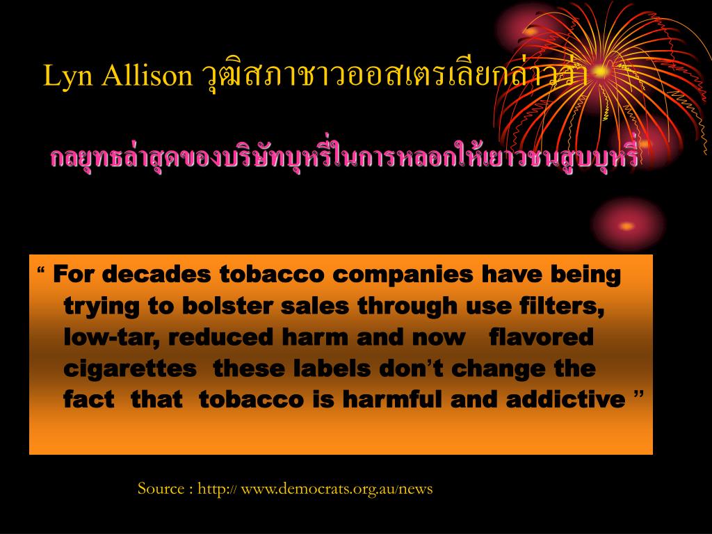 Lyn Allison วุฒิสภาชาวออสเตรเลียกล่าวว่า กลยุทธล่าสุดของบริษัทบุหรี่ในการหลอกให้เยาวชนสูบบุหรี่ “ For decades tobacco companies have being trying to bolster sales through use filters, low-tar, reduced harm and now flavored cigarettes these labels don’t change the fact that tobacco is harmful and addictive ” Source : http:// www.democrats.org.au/news