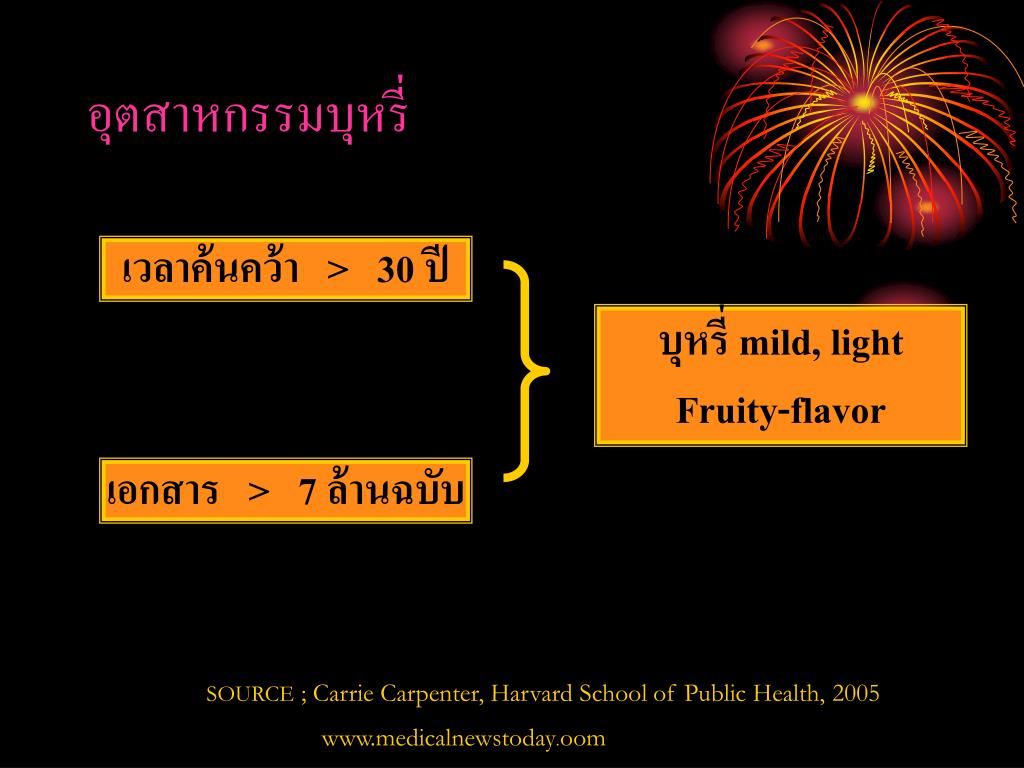 อุตสาหกรรมบุหรี่ เวลาค้นคว้า > 30 ปี บุหรี่ mild, light Fruity-flavor เอกสาร > 7 ล้านฉบับ SOURCE ; Carrie Carpenter, Harvard School of Public Health, 2005 www.medicalnewstoday.oom