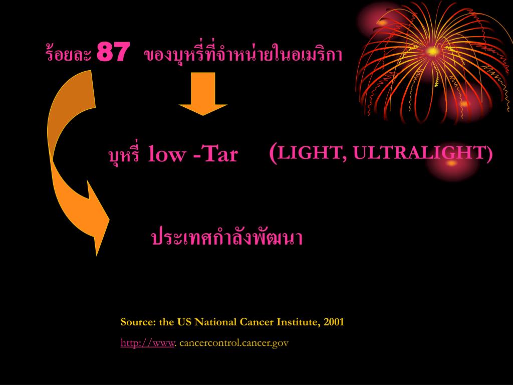 ร้อยละ 87 ของบุหรี่ที่จำหน่ายในอเมริกา (LIGHT, ULTRALIGHT) บุหรี่ low -Tar ประเทศกำลังพัฒนา Source: the US National Cancer Institute, 2001 http://www. cancercontrol.cancer.gov