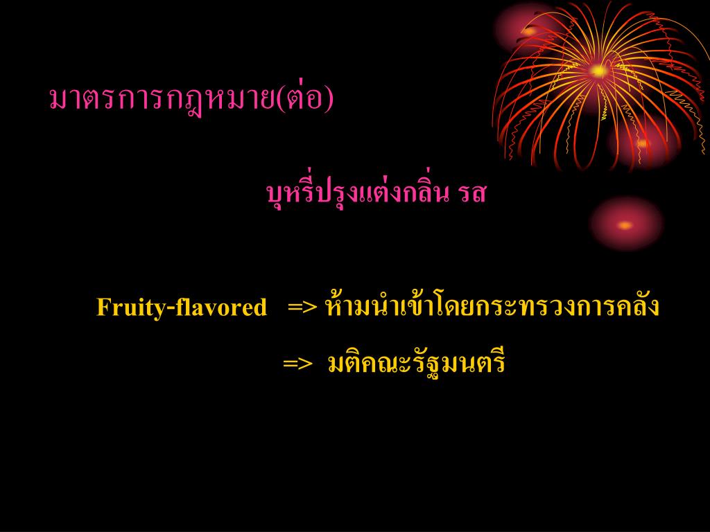 มาตรการกฎหมาย(ต่อ) บุหรี่ปรุงแต่งกลิ่น รส Fruity-flavored => ห้ามนำเข้าโดยกระทรวงการคลัง => มติคณะรัฐมนตรี