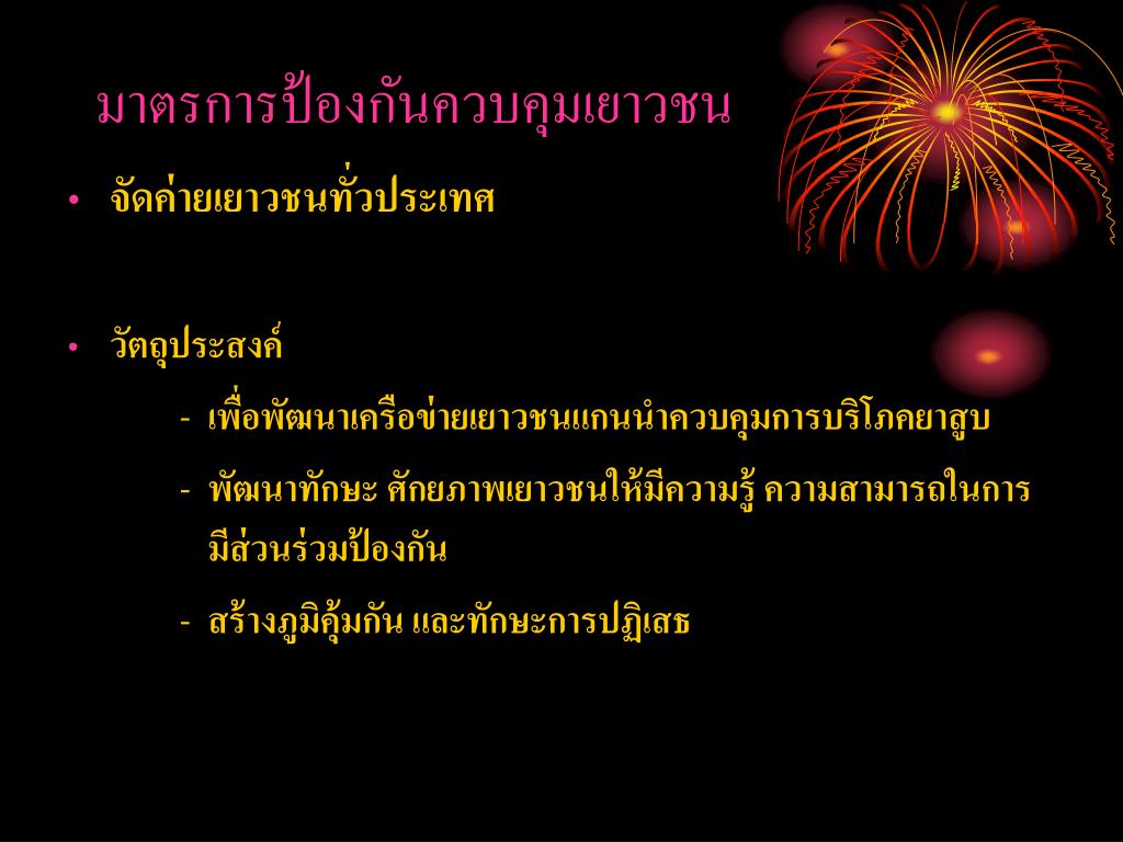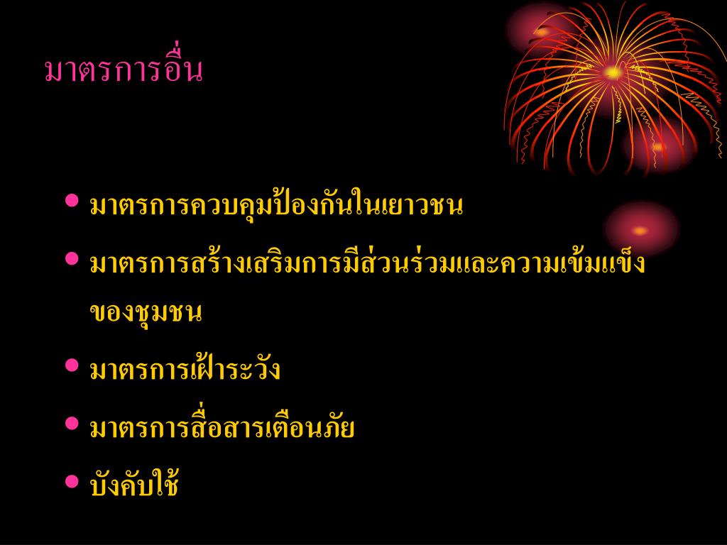 มาตรการอื่น • มาตรการควบคุมป้องกันในเยาวชน • มาตรการสร้างเสริมการมีส่วนร่วมและความเข้มแข็งของชุมชน • มาตรการเฝ้าระวัง • มาตรการสื่อสารเตือนภัย • บังคับใช้