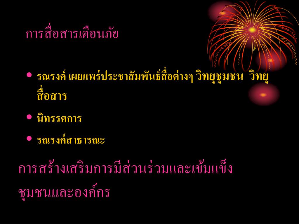 การสื่อสารเตือนภัย • รณรงค์ เผยแพร่ประชาสัมพันธ์สื่อต่างๆ วิทยุชุมชน วิทยุสื่อสาร • นิทรรศการ • รณรงค์สาธารณะ การสร้างเสริมการมีส่วนร่วมและเข้มแข็งชุมชนและองค์กร