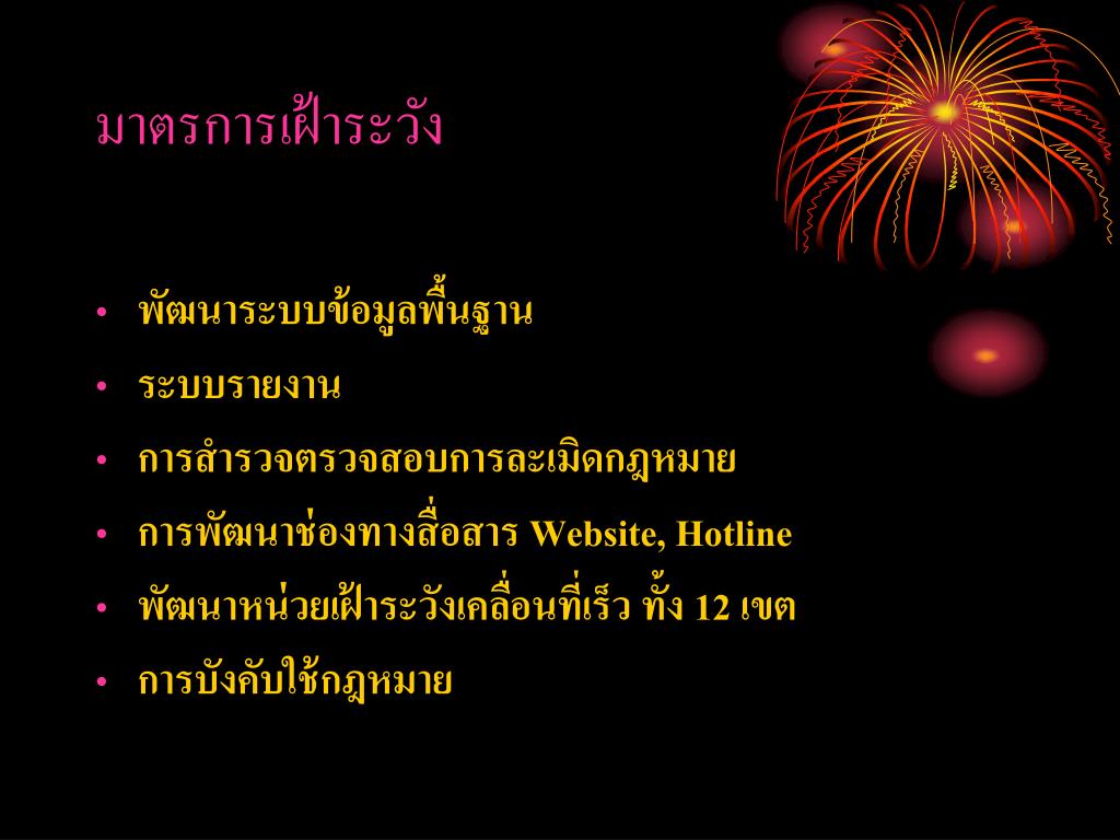 มาตรการเฝ้าระวัง • พัฒนาระบบข้อมูลพื้นฐาน • ระบบรายงาน • การสำรวจตรวจสอบการละเมิดกฎหมาย • การพัฒนาช่องทางสื่อสาร Website, Hotline • พัฒนาหน่วยเฝ้าระวังเคลื่อนที่เร็ว ทั้ง 12 เขต • การบังคับใช้กฎหมาย