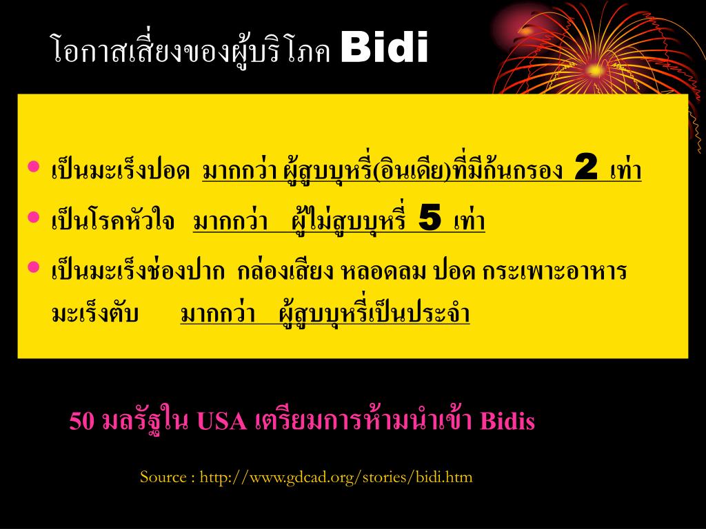 โอกาสเสี่ยงของผู้บริโภค Bidi • เป็นมะเร็งปอด มากกว่า ผู้สูบบุหรี่(อินเดีย)ที่มีก้นกรอง 2 เท่า • เป็นโรคหัวใจ มากกว่า ผู้ไม่สูบบุหรี่ 5 เท่า • เป็นมะเร็งช่องปาก กล่องเสียง หลอดลม ปอด กระเพาะอาหาร มะเร็งตับ มากกว่า ผู้สูบบุหรี่เป็นประจำ 50 มลรัฐใน USA เตรียมการห้ามนำเข้า Bidis Source : http://www.gdcad.org/stories/bidi.htm