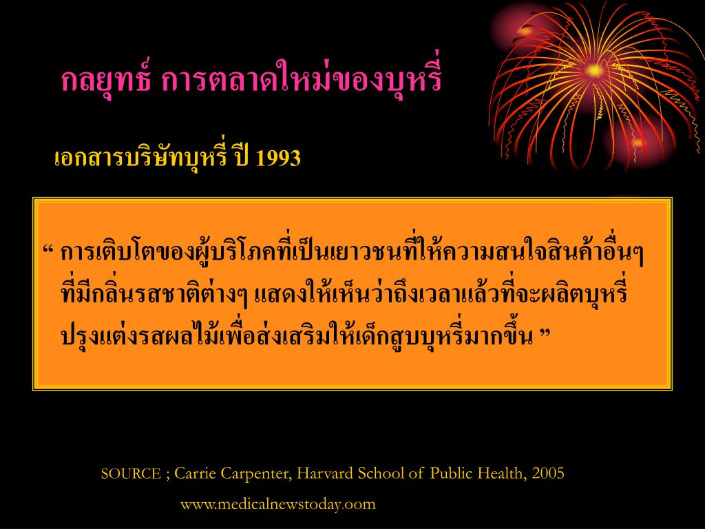 กลยุทธ์ การตลาดใหม่ของบุหรี่ เอกสารบริษัทบุหรี่ ปี 1993 “ การเติบโตของผู้บริโภคที่เป็นเยาวชนที่ให้ความสนใจสินค้าอื่นๆ ที่มีกลิ่นรสชาติต่างๆ แสดงให้เห็นว่าถึงเวลาแล้วที่จะผลิตบุหรี่ ปรุงแต่งรสผลไม้เพื่อส่งเสริมให้เด็กสูบบุหรี่มากขึ้น ” SOURCE ; Carrie Carpenter, Harvard School of Public Health, 2005 www.medicalnewstoday.oom