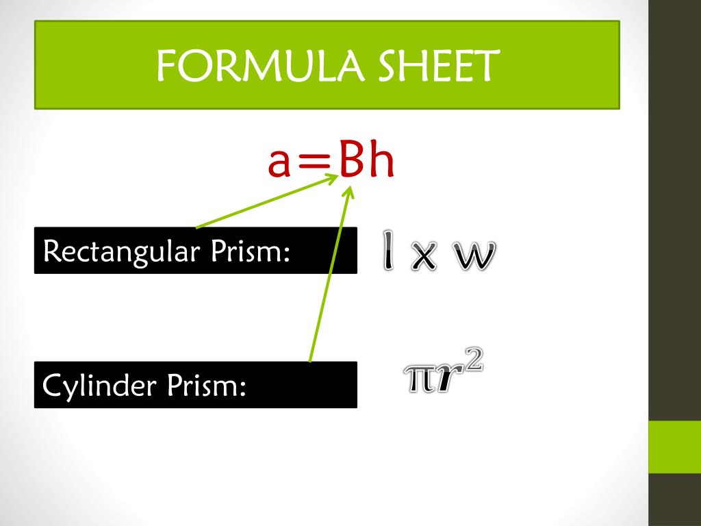 FORMULA SHEET a=Bh l x w Rectangular Prism: Cylinder Prism: