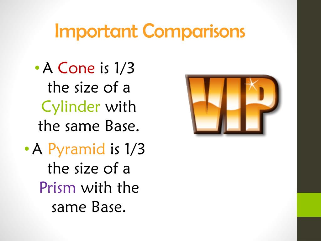 Important Comparisons • A Cone is 1/3 the size of a Cylinder with the same Base. • A Pyramid is 1/3 the size of a Prism with the same Base.