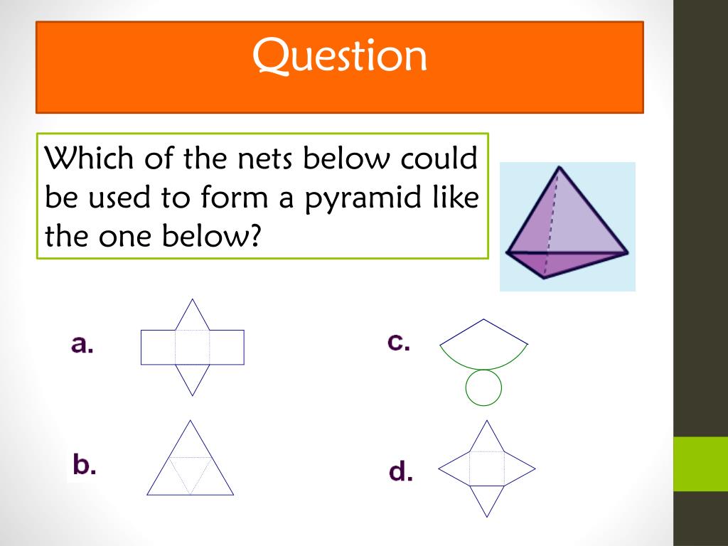 Question Which of the nets below could be used to form a pyramid like the one below?