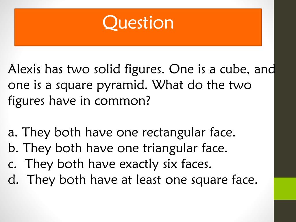 Question Alexis has two solid figures. One is a cube, and one is a square pyramid. What do the two figures have in common? a. They both have one rectangular face. b. They both have one triangular face. c. They both have exactly six faces. d. They both have at least one square face.
