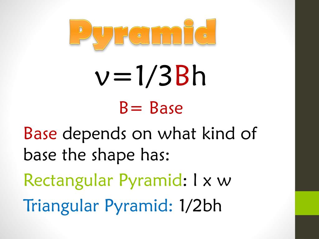 Pyramid v=1/3Bh B= Base Base depends on what kind of base the shape has: Rectangular Pyramid: l x w Triangular Pyramid: 1/2bh