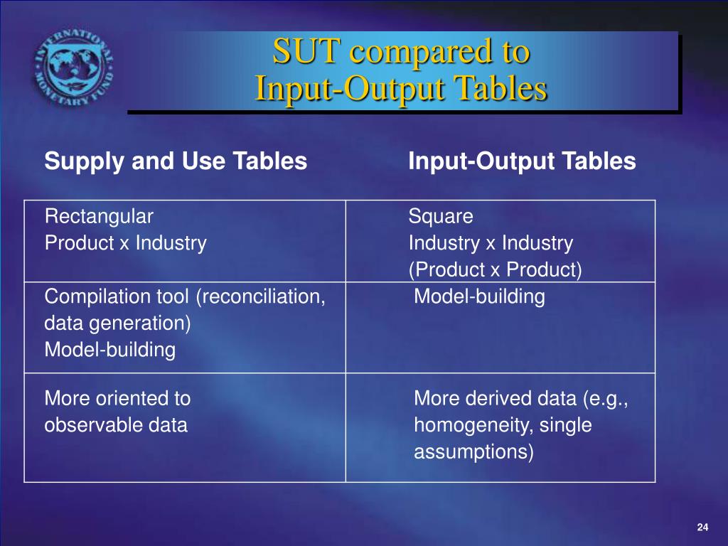 SUT compared to Input-Output Tables Supply and Use TablesInput-Output Tables Rectangular Square Product x Industry Industry x Industry (Product x Product) Compilation tool (reconciliation, Model-building data generation) Model-building More oriented to More derived data (e.g., observable data homogeneity, single assumptions)