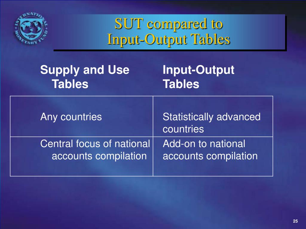 SUT compared to Input-Output Tables Supply and Use Input-Output Tables Tables Any countries Statistically advanced countries Central focus of national Add-on to national accounts compilation accounts compilation