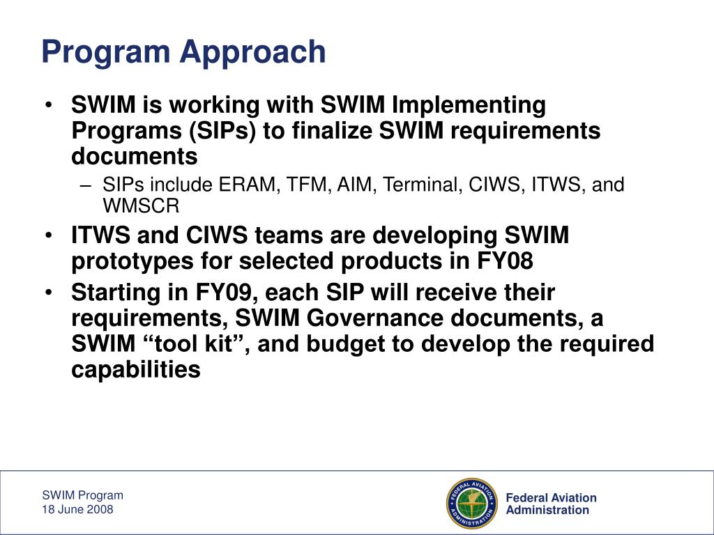 Program Approach • SWIM is working with SWIM Implementing Programs (SIPs) to finalize SWIM requirements documents • SIPs include ERAM, TFM, AIM, Terminal, CIWS, ITWS, and WMSCR • ITWS and CIWS teams are developing SWIM prototypes for selected products in FY08 • Starting in FY09, each SIP will receive their requirements, SWIM Governance documents, a SWIM “tool kit”, and budget to develop the required capabilities