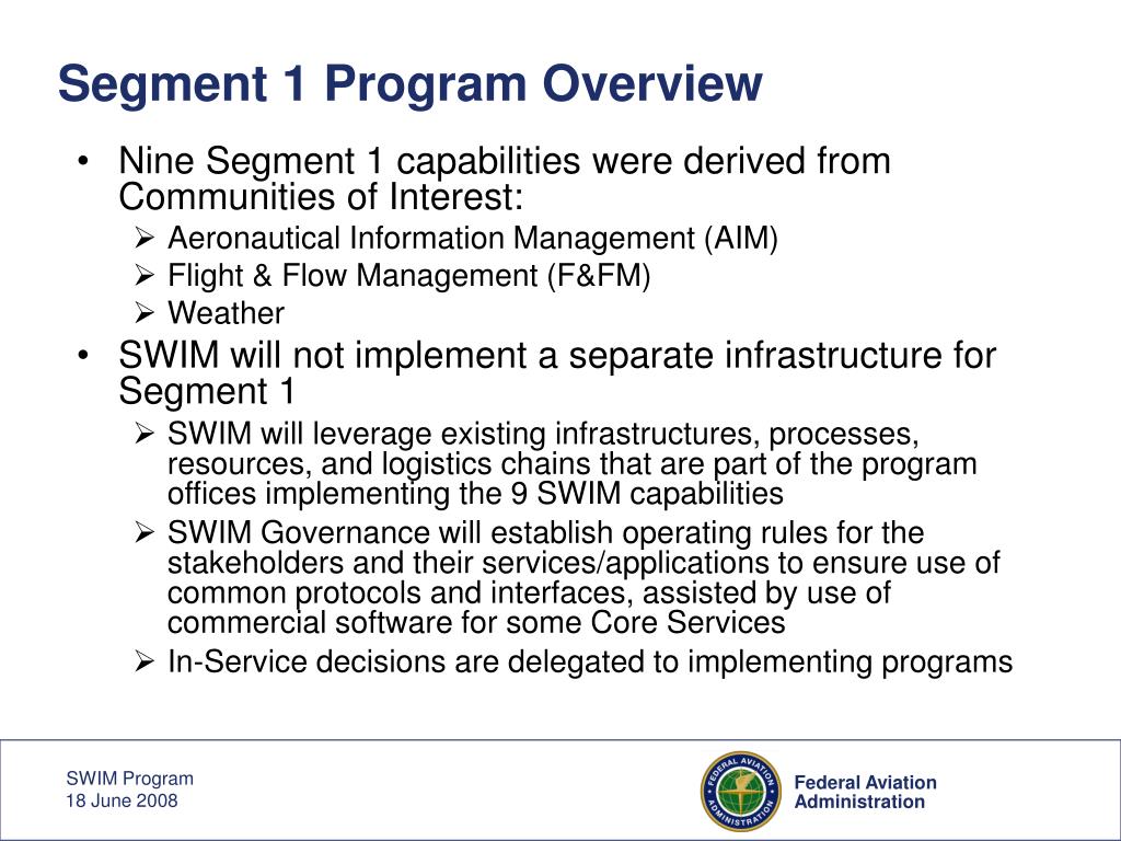 Segment 1 Program Overview • Nine Segment 1 capabilities were derived from Communities of Interest: • Aeronautical Information Management (AIM) • Flight & Flow Management (F&FM) • Weather • SWIM will not implement a separate infrastructure for Segment 1 • SWIM will leverage existing infrastructures, processes, resources, and logistics chains that are part of the program offices implementing the 9 SWIM capabilities • SWIM Governance will establish operating rules for the stakeholders and their services/applications to ensure use of common protocols and interfaces, assisted by use of commercial software for some Core Services • In-Service decisions are delegated to implementing programs