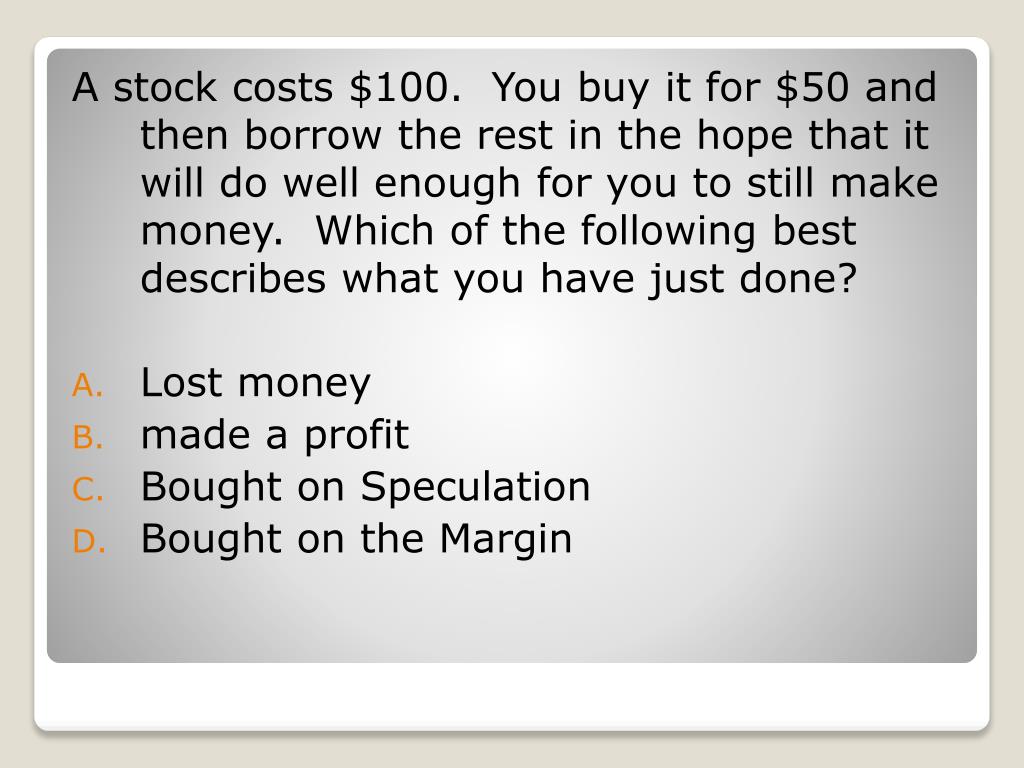 A stock costs $100. You buy it for $50 and then borrow the rest in the hope that it will do well enough for you to still make money. Which of the following best describes what you have just done? • Lost money • made a profit • Bought on Speculation • Bought on the Margin