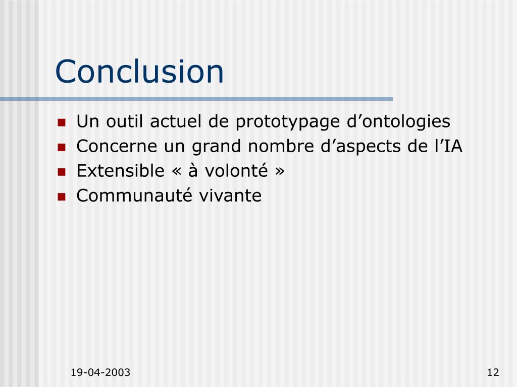 Conclusion • Un outil actuel de prototypage d’ontologies • Concerne un grand nombre d’aspects de l’IA • Extensible « à volonté » • Communauté vivante