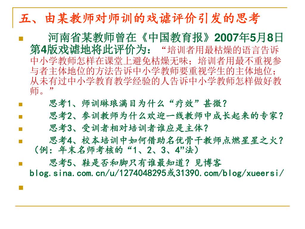 五、由某教师对师训的戏谑评价引发的思考 • 河南省某教师曾在《中国教育报》2007年5月8日第4版戏谑地将此评价为:“培训者用最枯燥的语言告诉中小学教师怎样在课堂上避免枯燥无味;培训者用最不重视参与者主体地位的方法告诉中小学教师要重视学生的主体地位;从未有过中小学教育教学经验的人告诉中小学教师怎样做好教师。” • 思考1、师训琳琅满目为什么“疗效”甚微? • 思考2、参训教师为什么欢迎一线教师中成长起来的专家? • 思考3、受训者相对培训者谁应是主体? • 思考4、校本培训中如何借助名优骨干教师点燃星星之火?(例:年末名师考核的“1、2、3、4”法) • 思考5、鞋是否和脚只有谁最知道?见博客blog.sina.com.cn/u/1274048295或31390.com/blog/xueersi/