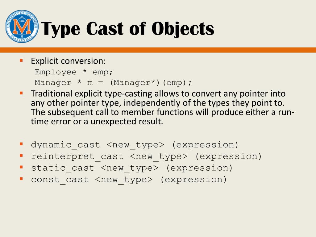 Type Cast of Objects • Explicit conversion: Employee * emp; Manager * m = (Manager*)(emp); • Traditional explicit type-casting allows to convert any pointer into any other pointer type, independently of the types they point to. The subsequent call to member functions will produce either a run-time error or a unexpected result. • dynamic_cast <new_type> (expression) • reinterpret_cast<new_type> (expression) • static_cast<new_type> (expression) • const_cast<new_type> (expression)